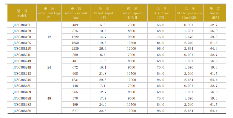 产品系列: JC8038B12L-01:12V;0.489A;5.9W;7000R.P.M;56.0CFM;0.907inchH2O;52.7dBA; JC8038B12M-01:12V;0.875A;10.5W;8500R.P.M;68.0CFM;1.337inchH2O;56.9dBA; JC8038B12H-01:12V;1.222A;14.7W;9500R.P.M;76.0CFM;1.670inchH2O;59.3dBA; JC8038B12S-01:12V;1.65A;19.8W;10500R.P.M;84.0CFM;2.040inchH2O;61.5dBA; JC8038B12U-01:12V;2.239A;26.9W;12000R.P.M;96.0CFM;2.664inchH2O;64.4dBA; JC8038B24L-01:24V;0.269A;6.5W;7000R.P.M;56.0CFM;0.907inchH2O;52.7dBA; JC8038B24M-01:24V;0.481A;11.6W;8500R.P.M;68.0CFM;1.337inchH2O;56.9dBA; JC8038B24H-01:24V;0.672A;16.1W;9500R.P.M;76.0CFM;1.670inchH2O;59.3dBA; JC8038B24S-01:24V;0.908A;21.8W;10500R.P.M;84.0CFM;2.040inchH2O;61.5dBA; JC8038B24U-01:24V;1.231A;29.6W;12000R.P.M;96.0CFM;2.664inchH2O;64.4dBA; JC8038B48L-01:48V;0.148A;7.1W;7000R.P.M;56.0CFM;0.907inchH2O;52.7dBA; JC8038B48M-01:48V;0.265A;12.7W;8500R.P.M;68.0CFM;1.337inchH2O;56.9dBA; JC8038B48H-01:48V;0.37A;17.7W;9500R.P.M;76.0CFM;1.670inchH2O;59.3dBA; JC8038B48S-01:48V;0.499A;24.0W;10500R.P.M;84.0CFM;2.040inchH2O;61.5dBA; JC8038B48U-01:48V;0.677A;32.5W;12000R.P.M;96.0CFM;2.664inchH2O;64.4dBA;