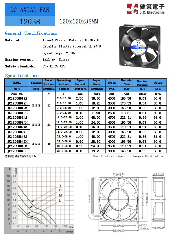 JC12038B12H 电压12V 功率19.2W 转速3500RPM 风量173.3CFM 静压0.54InchH2O 噪音值55dB