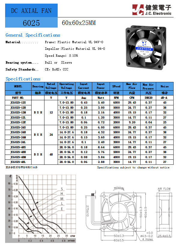 JC6025B48M 电压48V 功率3.84W 转速4000RPM 风量19.15CFM 静压0.17InchH2O 噪音值32dB