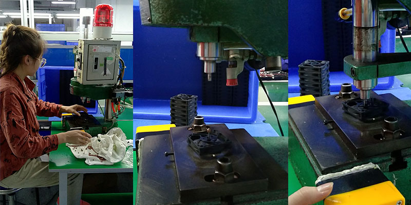 2、作业员一手拿起外框,放在气压床下模之中,另一手同事拿出含油轴承套入下模轴心上