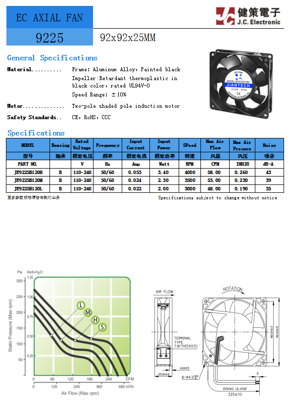 JE9225B120H 电压110-240V 功率3.4W 转速4000RPM 风量58CFM 静压0.26InchH2O 噪音值43dB