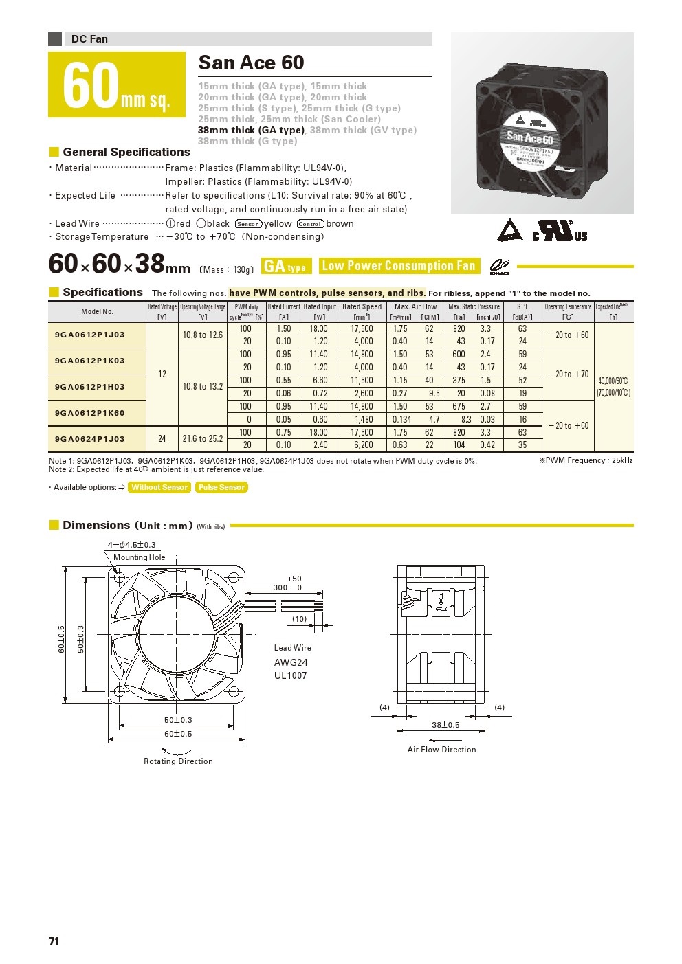 日本山洋Sanyo9GA0612P1K03直流低功耗散热风扇是一款DC直流低功耗风扇,尺寸为60*60*38mm,可选择PWM调速功能和FG测速信号、RD报警信号、停转自启动信号。这款DC轴流风机采用的是塑料制外框加上塑料叶轮,散热效果俱佳,广泛适用于交换机、服务器等的行业设备。