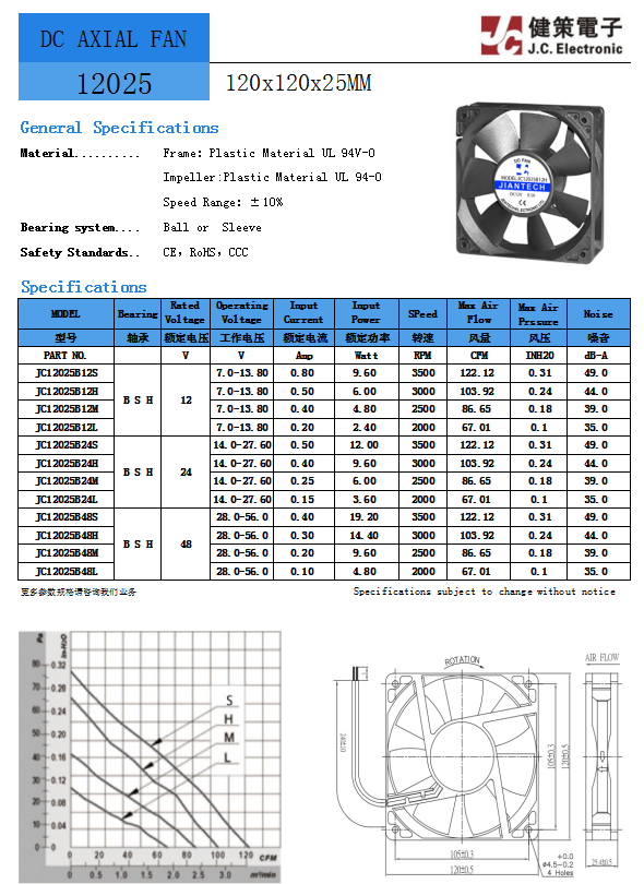 JC12025B12M 电压12V 功率4.8W 转速2500RPM 风量86.650CFM 静压0.18InchH2O 噪音值39dB