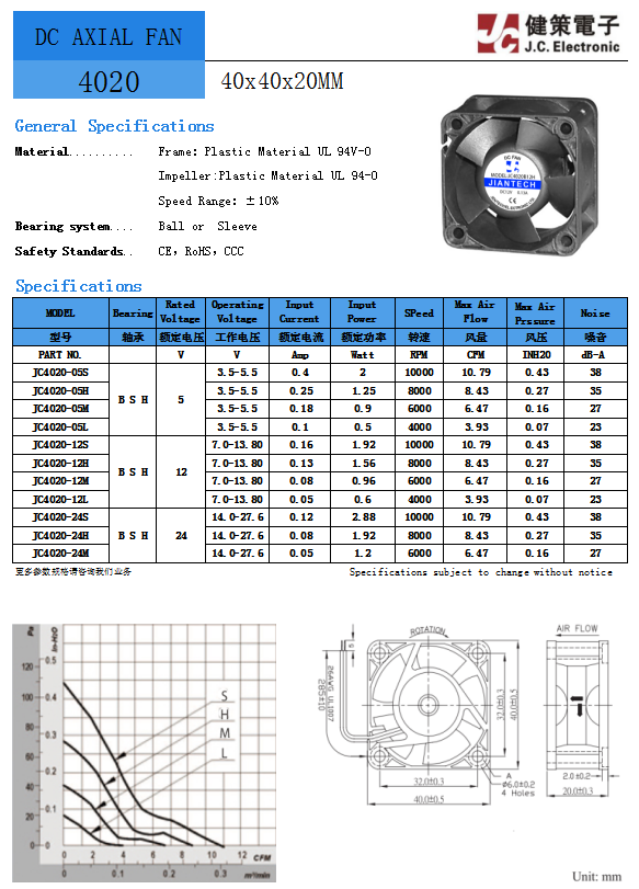JC4020B05L 电压5V 功率0.50W 转速4000RPM 风量3.93CFM 静压0.07InchH2O 噪音值23dB