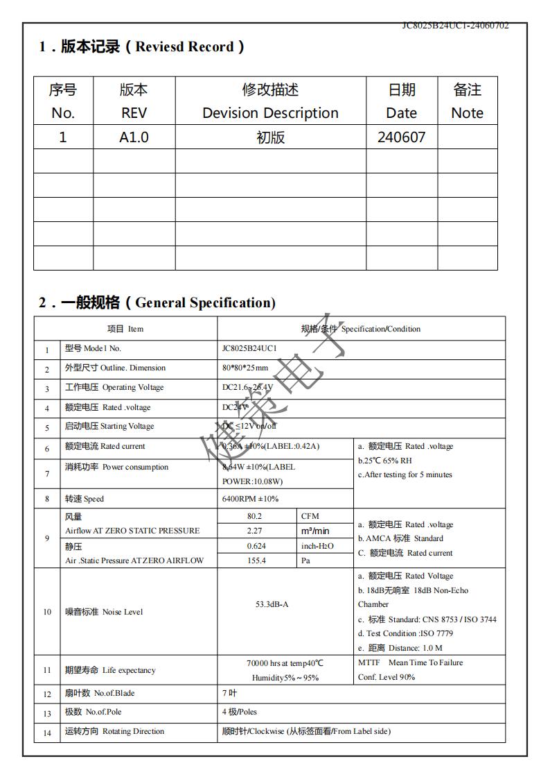 健策DC轴流风扇JC8025B24UC1-24060702产品详情说明: