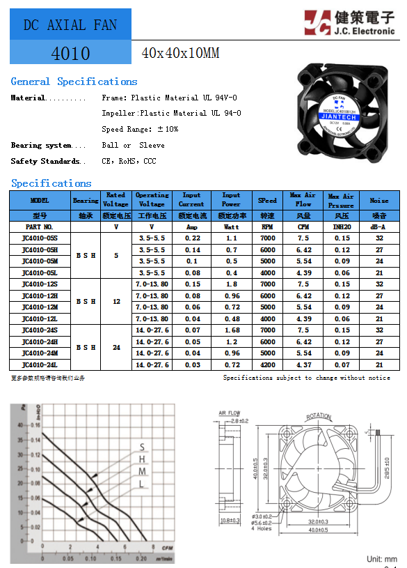 JC4010B05M 电压5V 功率0.5W 转速5000RPM 风量5.54CFM 静压0.09InchH2O 噪音值24dB