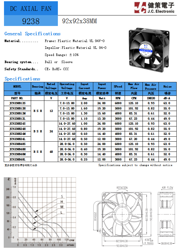 JC9238B24H 电压24V 功率19.2W 转速5000RPM 风量101.92CFM 静压0.82InchH2O 噪音值55dB