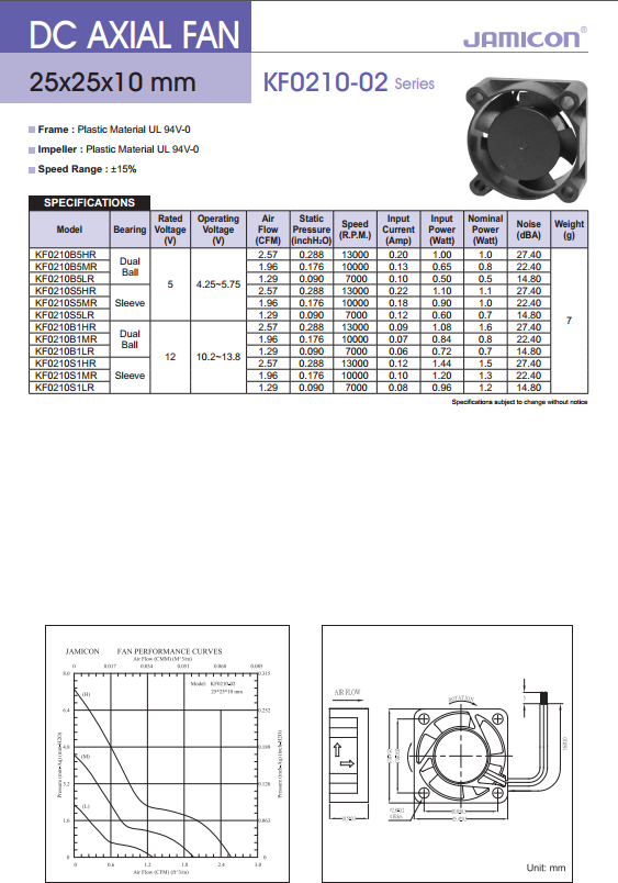 KF0210B5MR 电压5V 功率0.65W 转速10000RPM 风量1.96CFM 静压0.176InchH2O 噪音值22.4dB
