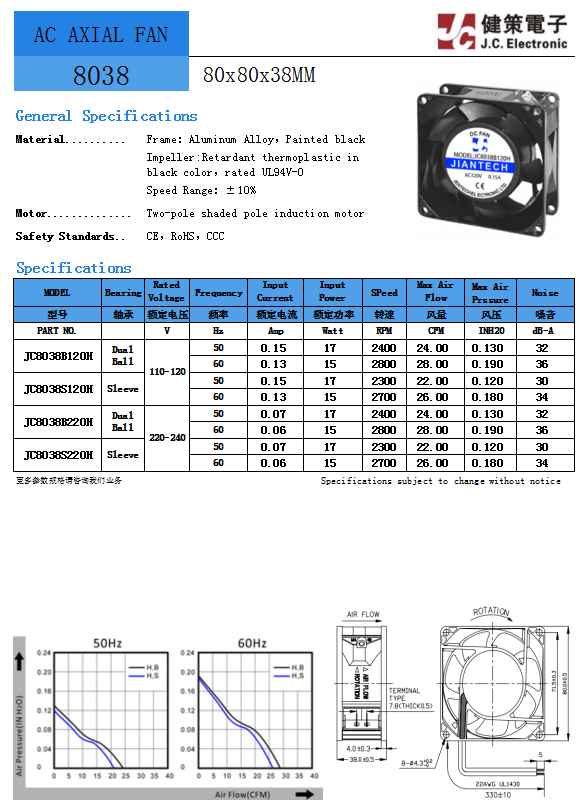 JC8038S120H 电压110-120V 频率50Hz 功率17W 转速2300RPM 风量22.0CFM 静压0.12InchH2O 噪音值30dB