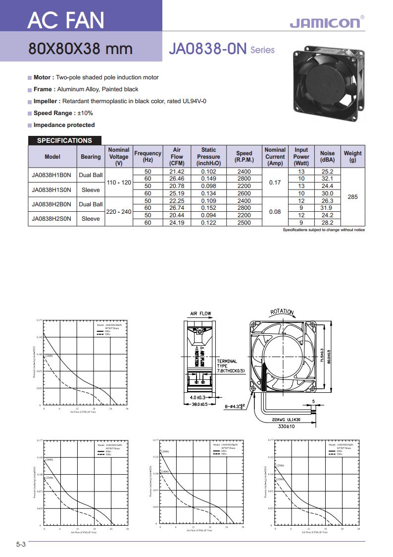 JA0838H1-0N 电压110V 功率13W 转速2400RPM 风量21.42CFM 静压0.102InchH2O 噪音值25.2dB