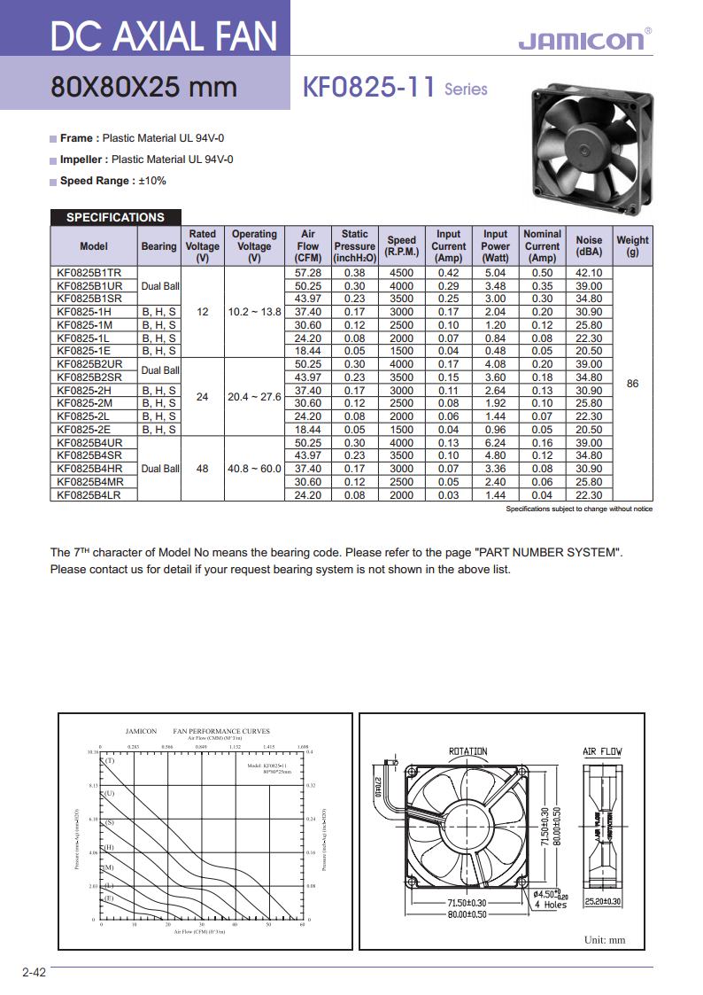 KF0825B1TR 电压12V 风量57.28CFM 转速4500RPM 功率5.04W 静压0.38InchH2O 噪音值42.10dB