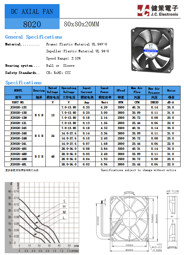 JC8020B48S 电压48V 功率3.84W 转速3500RPM 风量40.31CFM 静压0.14InchH2O 噪音值35dB