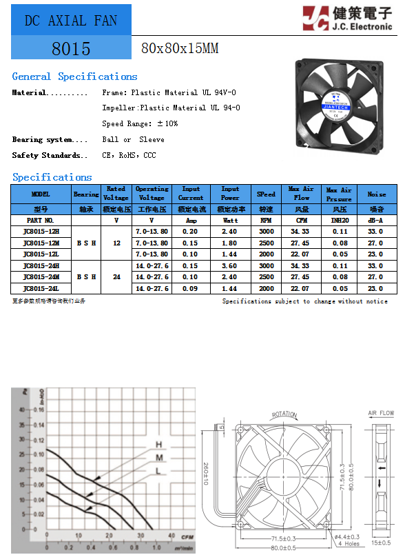 JC8015B12L 电压12V 功率1.44W 转速2000RPM 风量22.07CFM 静压0.05InchH2O 噪音值23dB