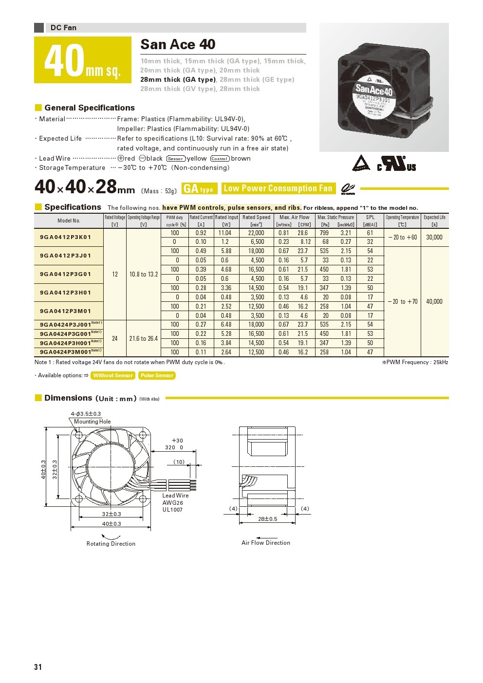 日本山洋Sanyo9GA0412P3K01直流低功耗散热风扇是一款DC直流低功耗风扇,尺寸为40*40*28mm,可选择PWM调速功能和FG测速信号、RD报警信号、停转自启动信号。这款DC轴流风机采用的是塑料制外框加上塑料叶轮,散热效果俱佳,广泛适用于交换机、服务器等的行业设备。