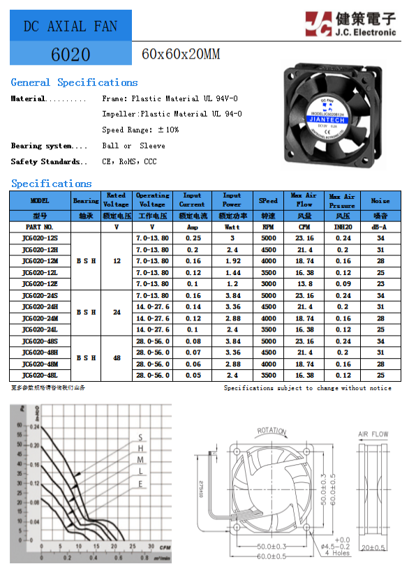 JC6020B48H 电压48V 功率3.36W 转速4500RPM 风量21.40CFM 静压0.20InchH2O 噪音值31dB