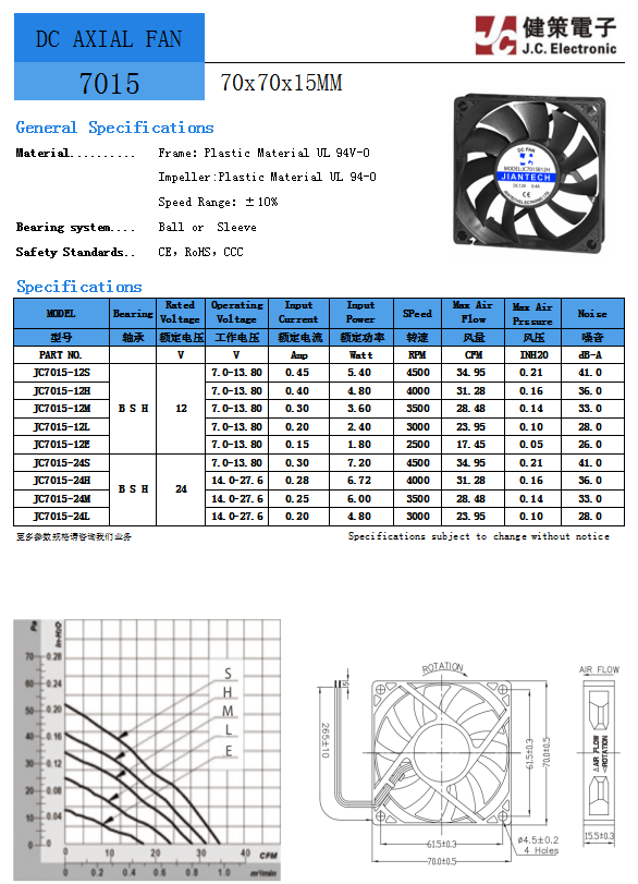 JC7015B12H 电压12V 功率4.80W 转速4000RPM 风量31.28CFM 静压0.16InchH2O 噪音值36dB