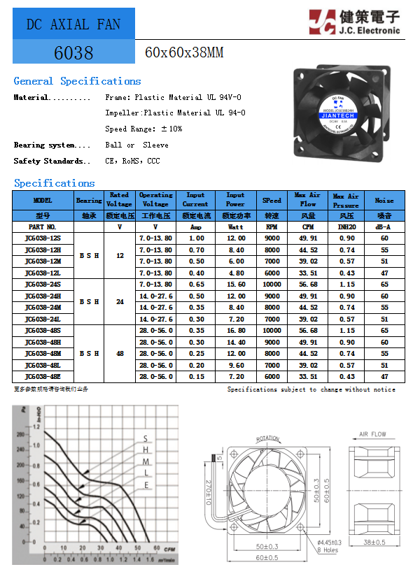 JC6038B48L 电压48V 功率9.60W 转速7000RPM 风量39.02CFM 静压0.57InchH2O 噪音值51dB