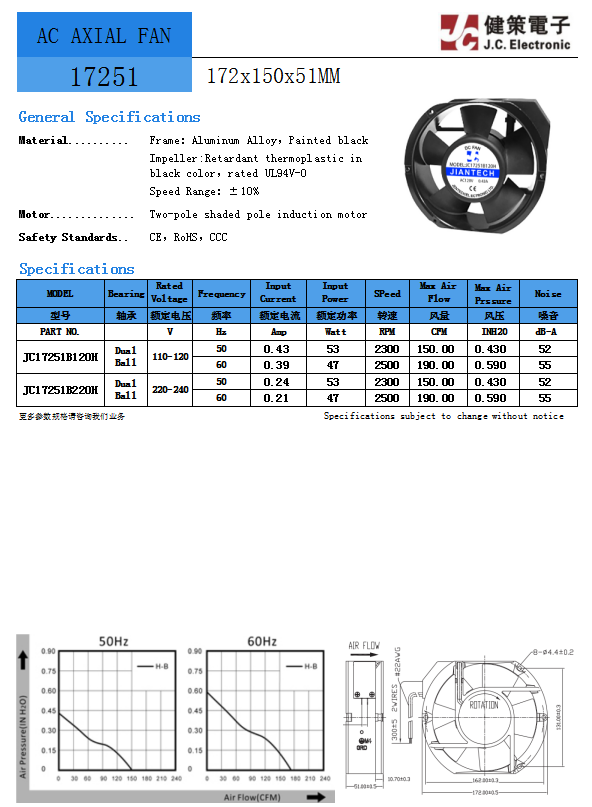 JC17251B120H 电压110-120V 频率50Hz 功率53W 转速23000RPM 风量150.0CFM 静压0.43InchH2O 噪音值52dB