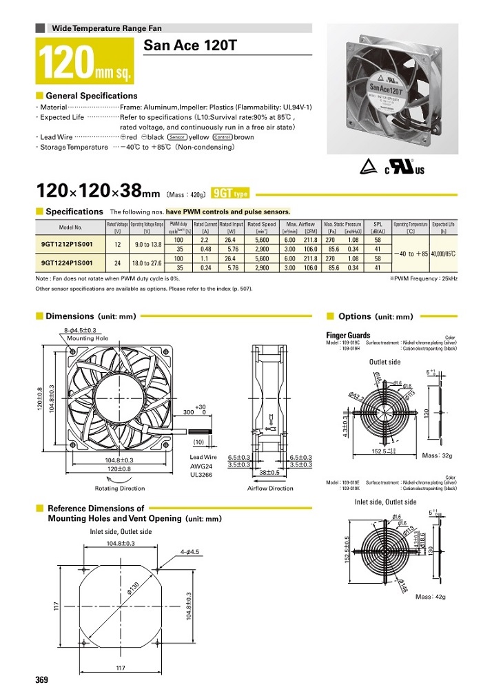 9GT1212P1S001 电流2.2A 功率26.4W 转速5600RPM 风量211.8CFM 风压270Pa 噪音58DB