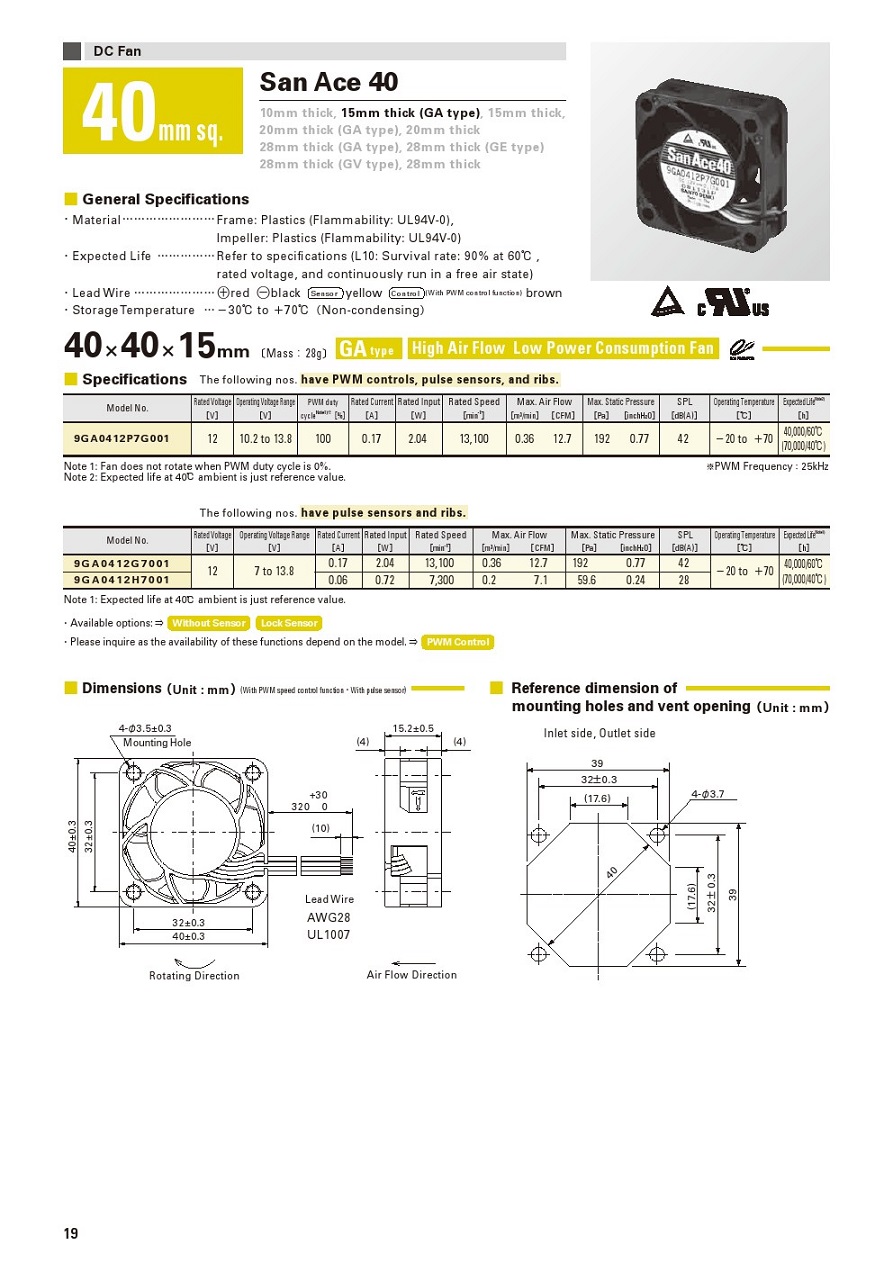 Sanyo山洋的9GA0412G7001直流低功耗散热风扇是一款低功耗风扇,适用于有些较难维修且功耗不能太高的设备,最高转速为13100转,最大风压也达到了192Pa,能满足大多数服务器的散热要求,功耗最低值为0.72W,使用温度范围在-20℃至+70℃,使用寿命在60℃下为40000小时,9GA0412G7001直流低功耗散热风扇同时将低功耗、高转速、温度范围广等优点集于一身。