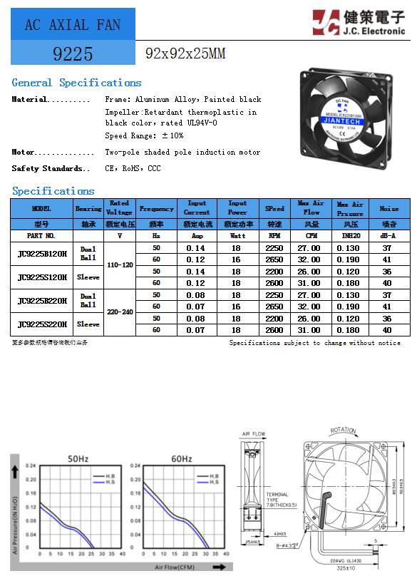 JC9225S120H 电压110-120V 频率50Hz 功率18W 转速2200RPM 风量26.0CFM 静压0.12InchH2O 噪音值36dB