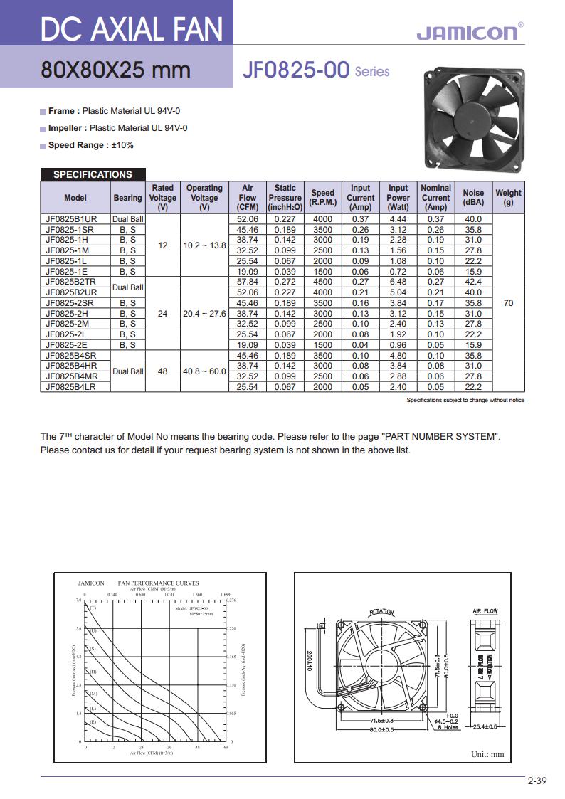 JF0825B2MR 电压48V 风量32.52CFM 转速2500RPM 功率2.88W 静压0.099InchH2O 噪音值27.8dB