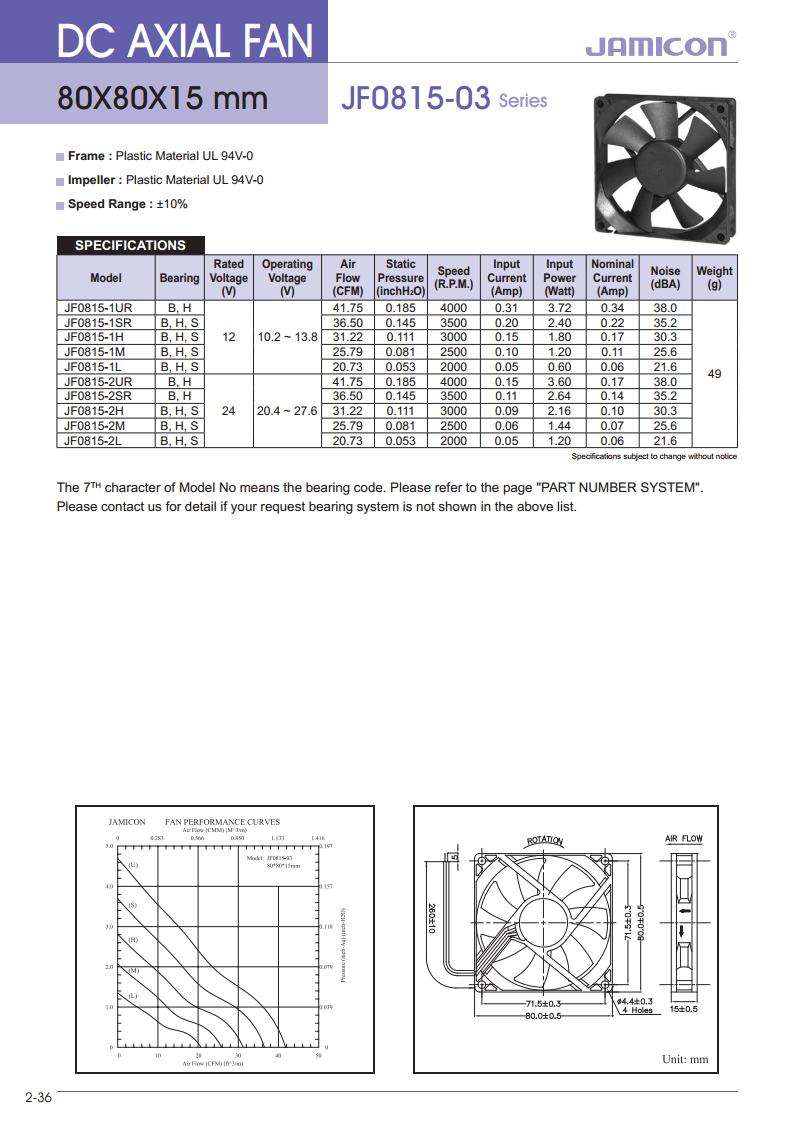 JF0815B2UR 电压24V 风量41.75CFM 转速4000RPM 功率3.60W 静压0.185InchH2O 噪音值38.0dB