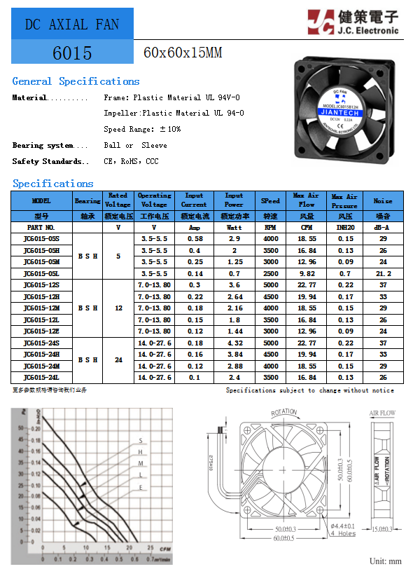 JC6015B12H 电压12V 功率2.64W 转速4500RPM 风量19.94CFM 静压0.17InchH2O 噪音值33dB