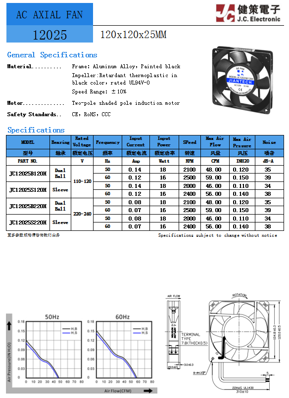 JC12025B120H 电压110-120V 频率50Hz 功率18W 转速2100RPM 风量48.0CFM 静压0.12InchH2O 噪音值35dB