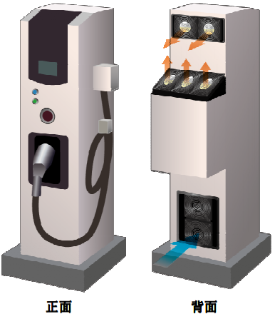 快速充电桩是能够给电动车充电的设备,安装于户外公共建筑和居民小区停车场和充电站内。因安装在室外对充电桩所搭载的散热风扇的防护等级要求较高,需要防水以及防尘的效果,另外快速充电桩只要15~30分钟即可充至80%的电量,而家用交流200V的普通充电需要充7小时左右,因此可大幅度减少充电时间,备受业界期待。