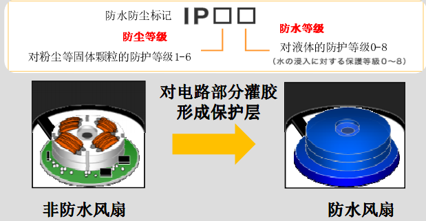 1、9WG5748P5H001防水散热风扇带IP68防水等级,是业界顶尖的防水防尘性能,防水风扇的电路板,线圈部分会用树脂保护,第三方权威机构测评,通过IP68认证。因户外天气多变,散热风扇经常直接接触水滴、灰尘,用防水散热风扇可以无后顾之忧,并且设备整体就可以减少防水防尘的设计,更有利于设备小型化,降低成本,减少加工工序。