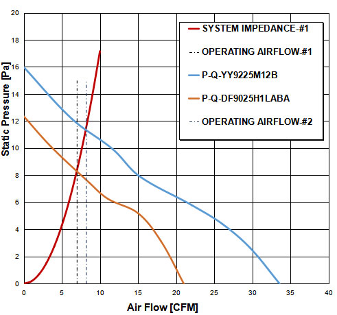 黄工通过去到客户公司用风洞仪测试系统风阻与散热风扇P-Q风量、风压曲线图比较参数,参考选型替代型号推荐台湾Jamicon凯美散热风扇DF0925H1LABA,直流风机12V,9225风扇,如下图所示,设备系统风阻较大,与之前使用型号YY9225M12B动作点分别是7CFM和8CFM相差较小,可以考虑替代;