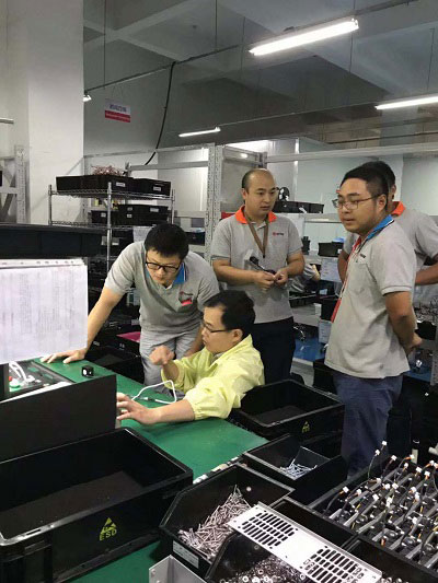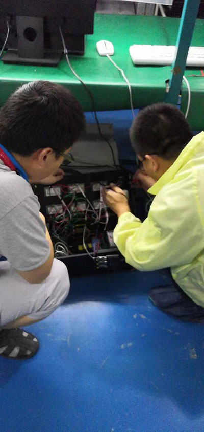 在现场测试中用示波器在冶具上实测信号线有无规则异常波形,看,我们的研发工程师们正在埋头测试与相互讨论呢,其中我司黄工建议散热风扇引线端子由Jamicon工厂直接做好出货,这样节省固德威二次加工成本与时间并避免人体或打端子机台等静电风险,二次加工周转及端子线序出错等额外损耗;