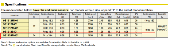 在参数规格书上我们可以看到9S1224M4011具体的参数:电流0.06A 功率 1.44W 转速1850R 风量58.5CFM 风压22.7Pa 噪音24dB。