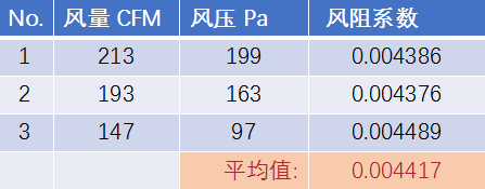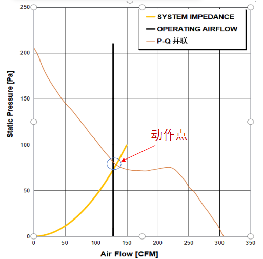 1、系统阻抗较高,动作点风量利用较小,4个风扇并联理论值307CFM,实际利用128CFM,低于常规最小0.5.