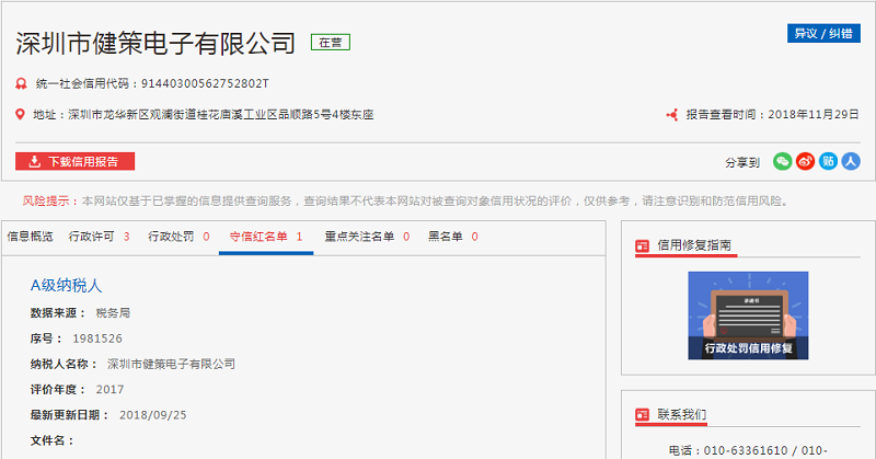 信用对一家企业来说是至关重要的,在广东省深圳市国家税务局公布的2017年度纳税信用A级纳税人名单中,深圳市健策电子有限公司榜上有名。